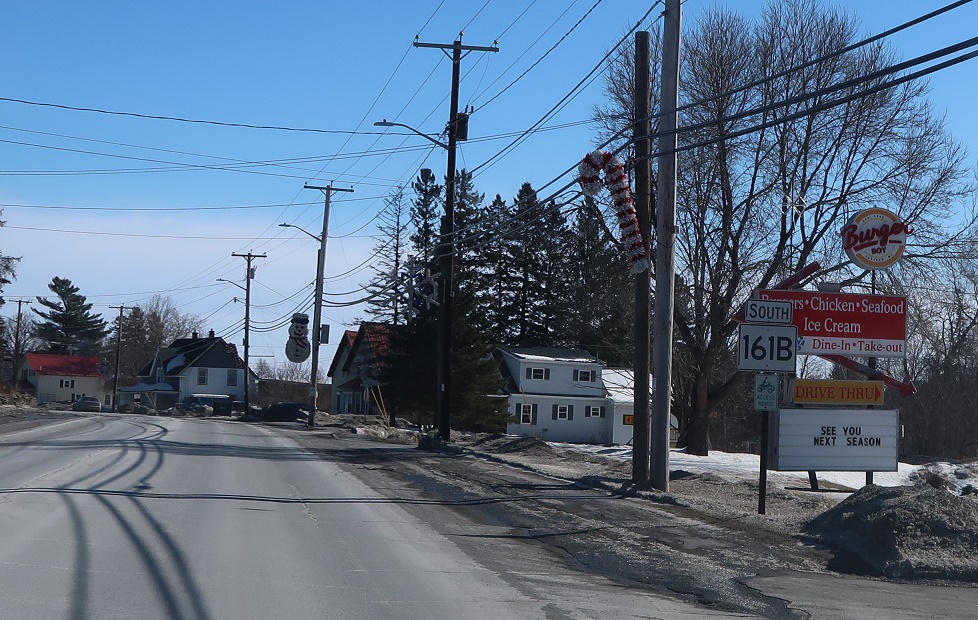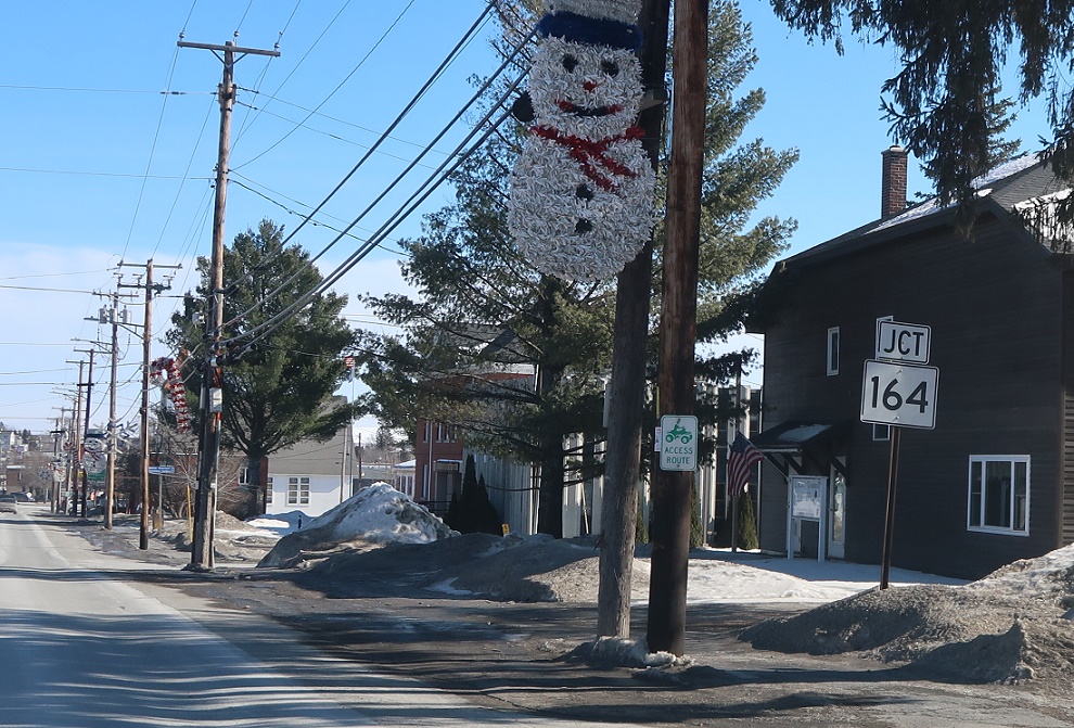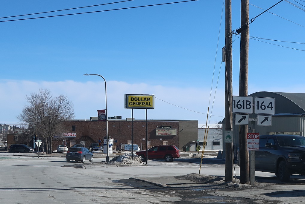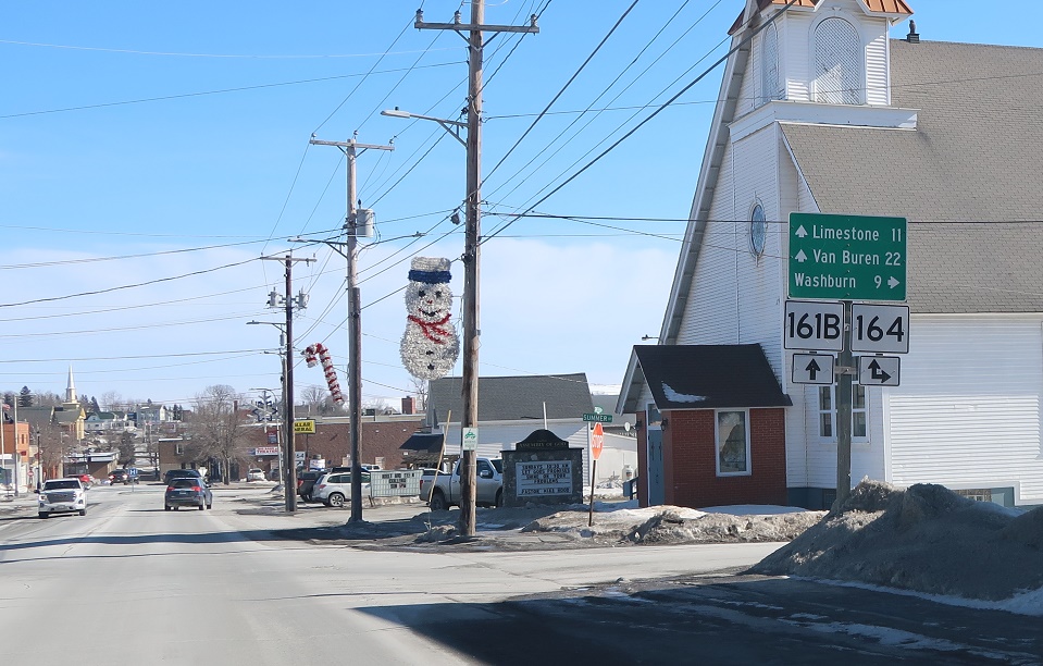 A few blocks later, keep right for Spring Street, which connects to SR 164 without having to go into the middle of Caribou.