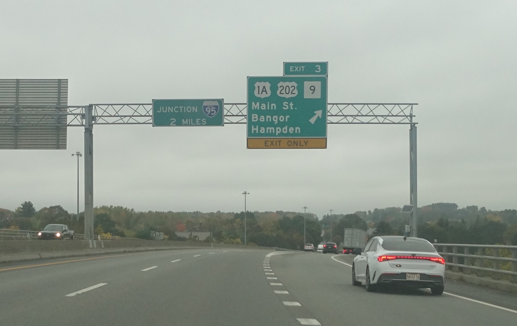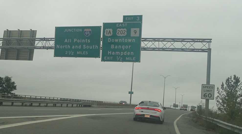 After crossing the river into Bangor, exit for 202 east, US-1A, and SR 9. US 202 west joins I-395 and SR 15.