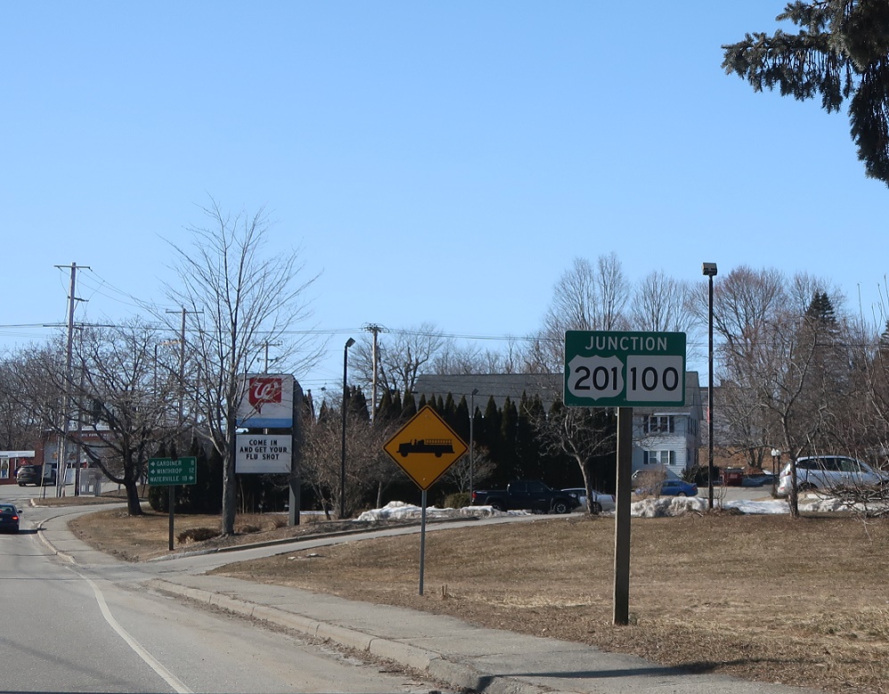Turn right for 201/100 north to Waterville. Turn left for 201/100 south and 202/9 west, which is unhelpfully not signed.