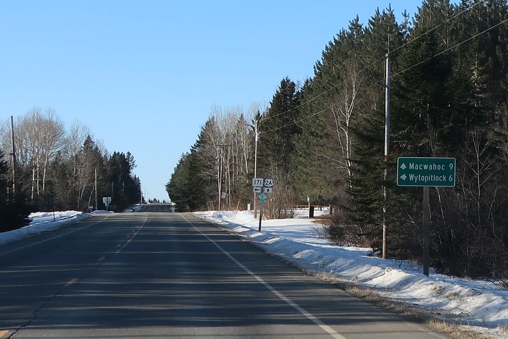 Soon thereafter, we’ll approach SR 171, which heads south to Wytopitlock. Stay on 2A west for Macwahoc.