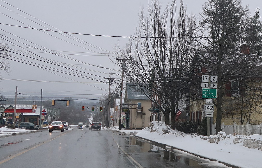 As we enter Dixfield, we’ll approach SR 142. Follow 142 north to Mt. Blue State Park and Weld. Stay straight to stay on 2/17 east.