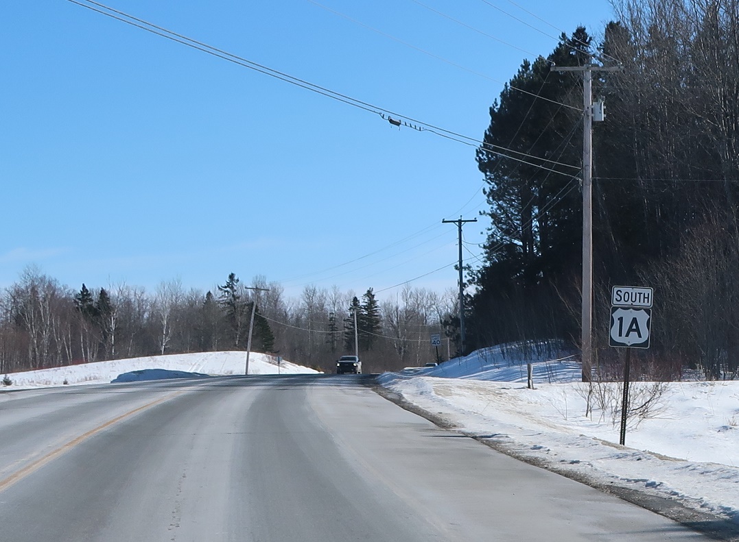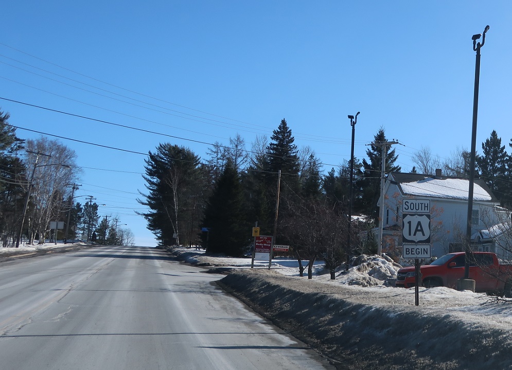 Reassurance shield as US 1A begins, continuing to hug the Canadian border where 1 cuts south down to Presque Isle.