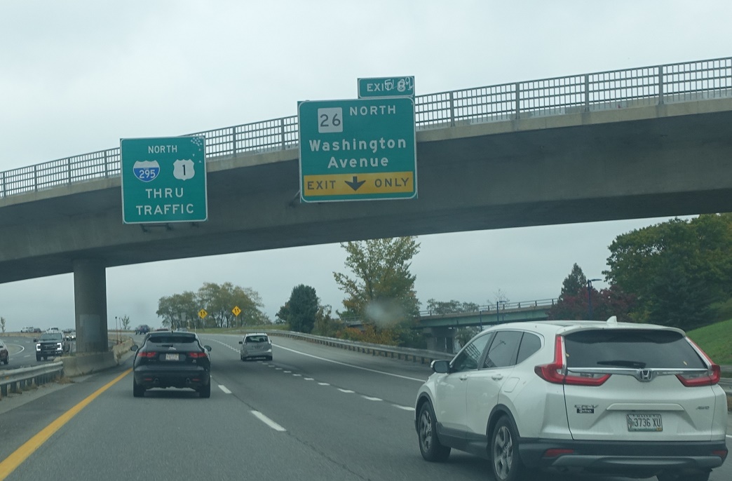 Just after US 1A, we’ll prepare for the SR 26 north exit. First, however, SR 26 south briefly joins I-295/US 1 at the onramp in the background.
