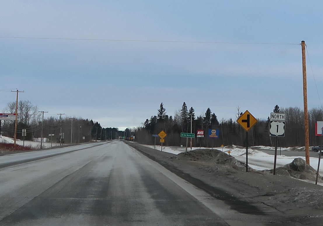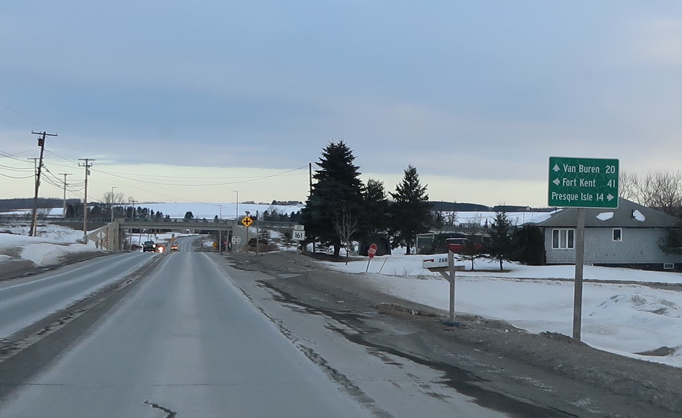 Soon thereafter, we’ll approach SR 161 again, which heads north to Fort Kent and south back via US 1 south to Presque Isle. Stay on 1 for Van Buren and a less direct routing to Fort Kent.