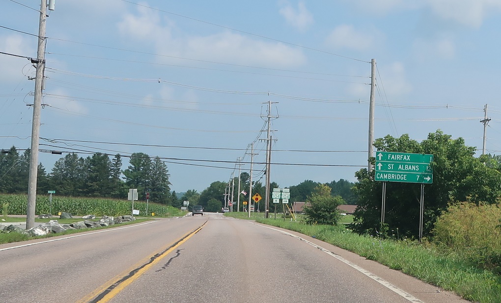 Follow 104 north to Fairfax center and on to St. Albans. Take 104 south to Cambridge.