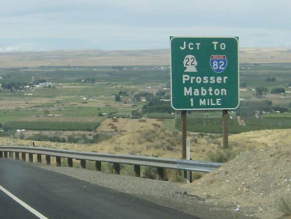 Junction SR 22. Turn right for 22 east which runs about a quarter mile to its eastern terminus at I-82, or stay on the west side of the Yakima and take SR 22 west