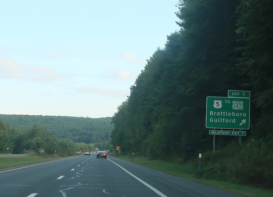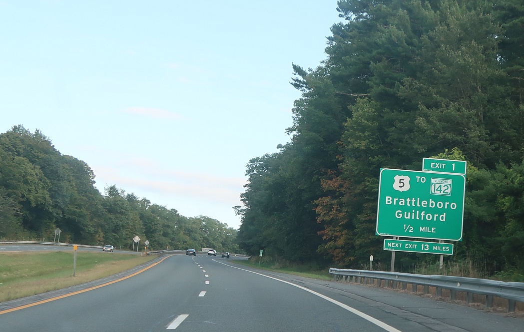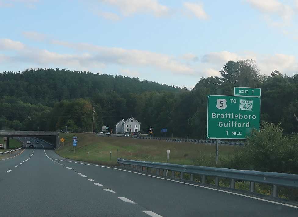 Exit for US 5, which heads south into Guilford and north back to downtown Brattleboro and Route 142.