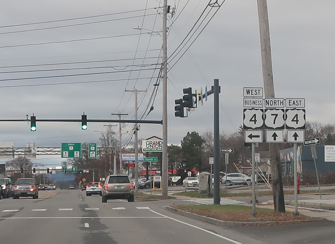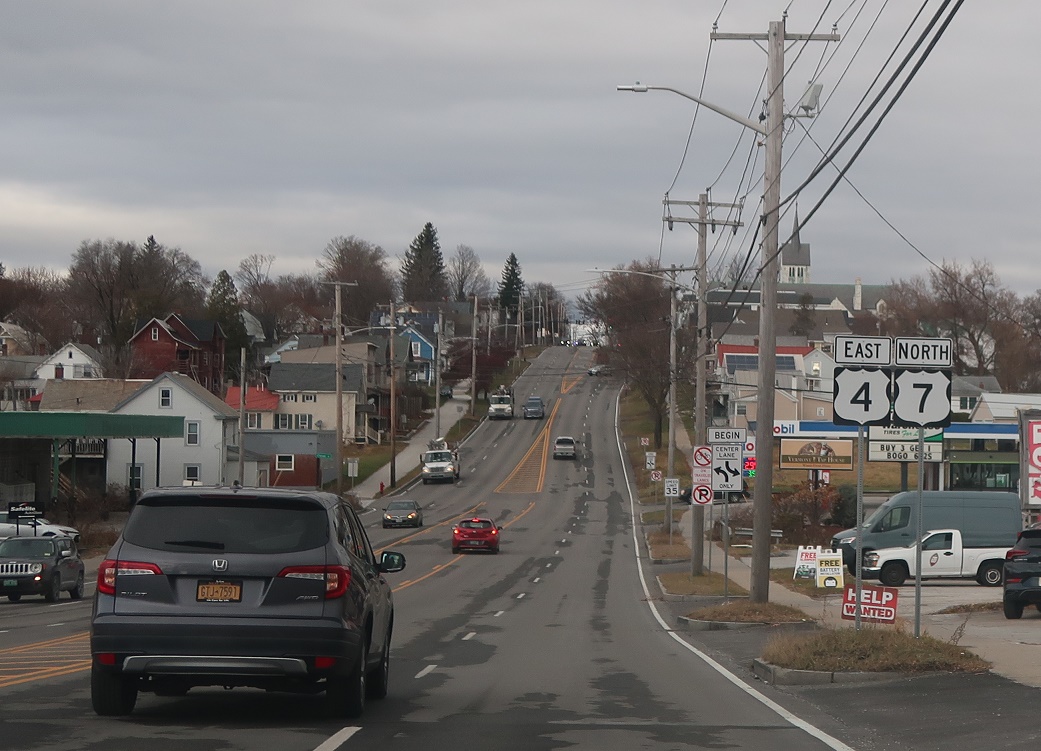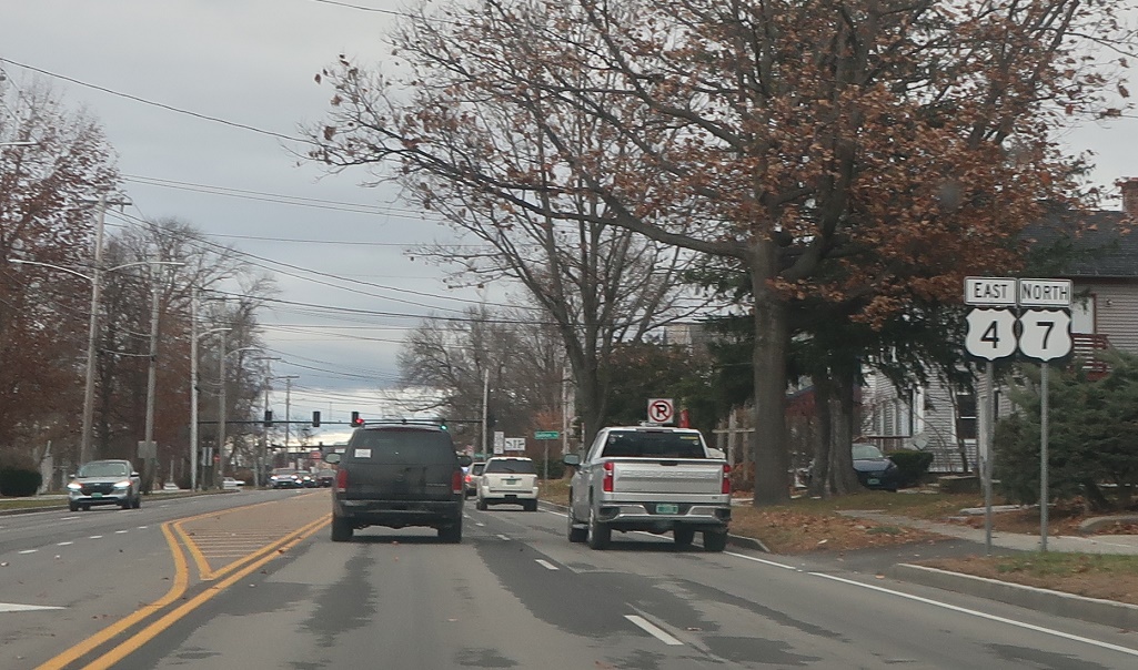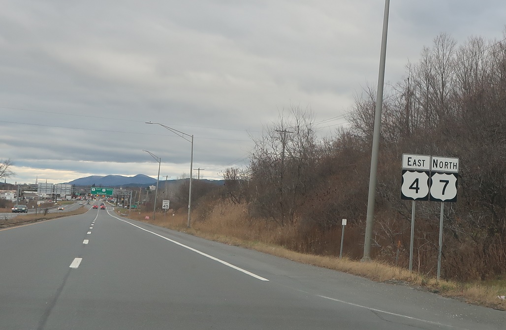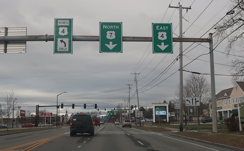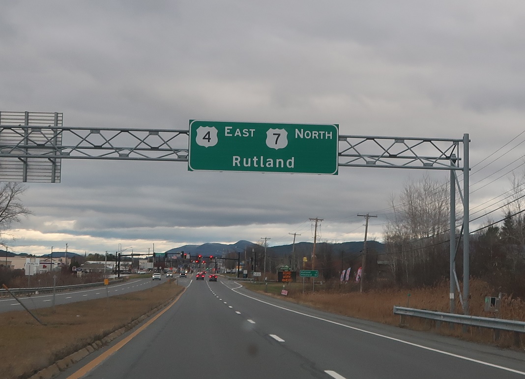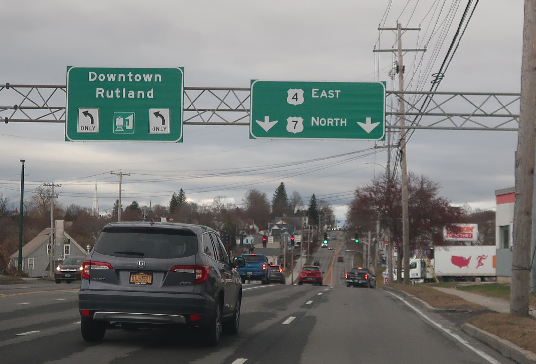 As we come into Rutland city, turn left to follow Strongs Avenue into downtown. Stay straight for 4 east/7 north, which bypass downtown to the east.