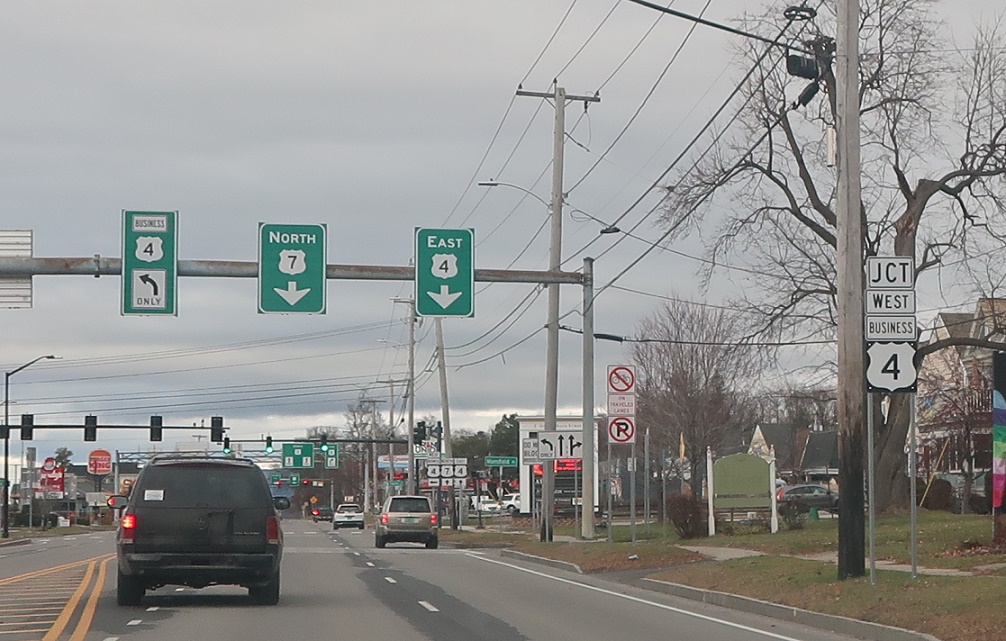 Turn left at the light for 4 Business west. Stay straight for 4 east/7 north, but go ahead and get in the right lane for 4 east and the left for 7 south, as the routes divide in another block.