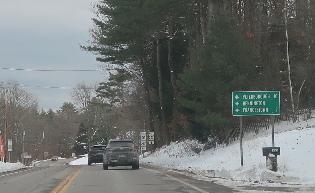 Follow 202 west to Peterborough. Take 31 south into Bennington, with Route 47 continuing to Francestown.