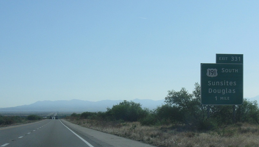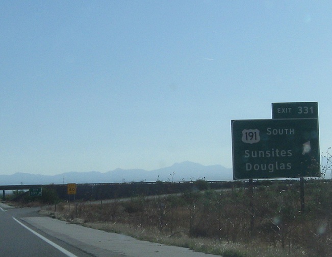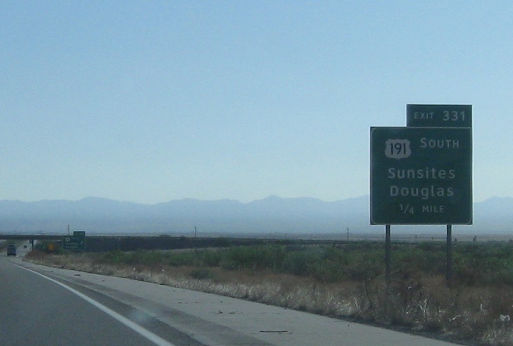 Exit for US-191 South towards Sunsites, Douglas, and Mexico. Stay on I-10 East for US-191 North
