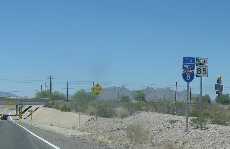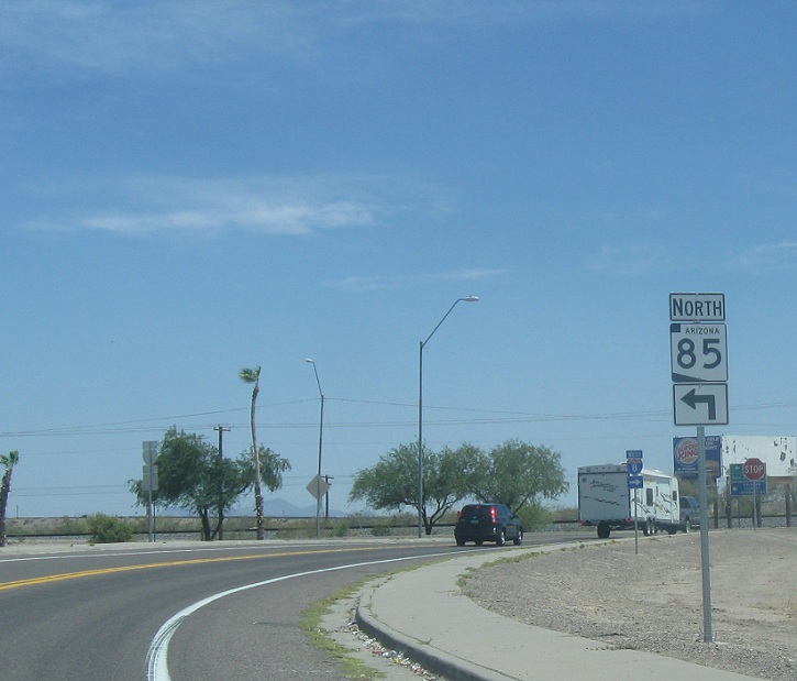 85 gets tricky through Gila Bend. On the supposed concurrency of the loop, it is marked as TO 85 and 85. It is the opinion of this site that SR 85 does not run concurrent with I-8 Business here. The mileposts end at 0 right here and then begin again at 120 at the end of the concurrency. The highway is defined in route logs as S 085 (1) (this segment) and S 085 (2) (the other segment), which is unlike every other highway in the system. The log also generally notes concurrencies, but it does not note one here. So follow Business Loop 8 East to SR 85 North.