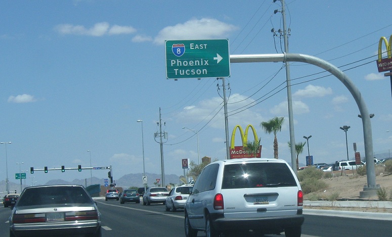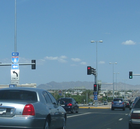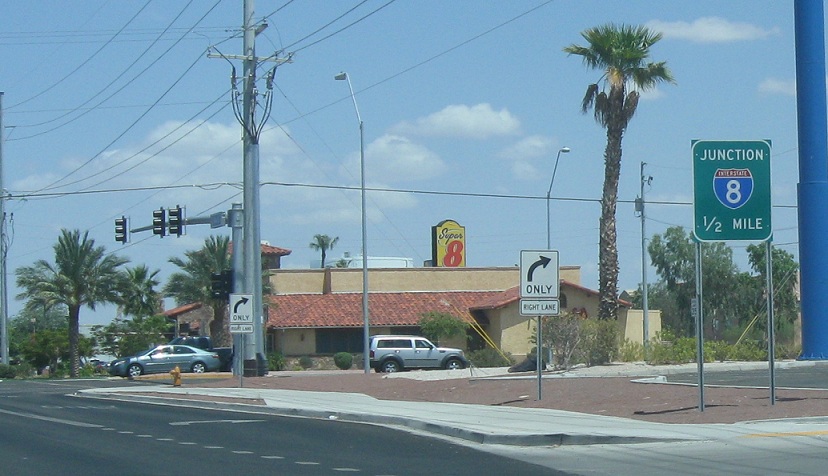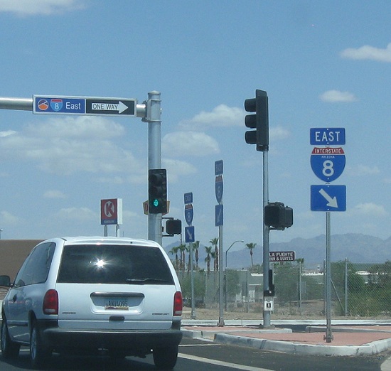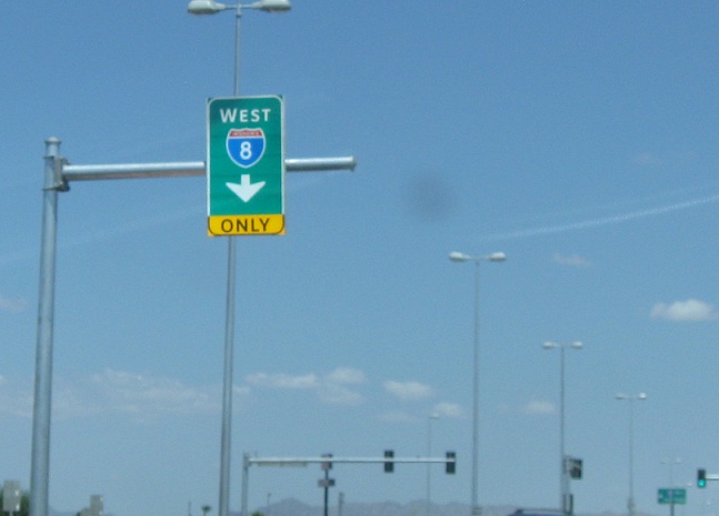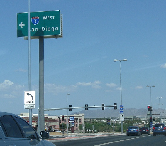 Turn right for I-8 east on this very California-esque style signage . Note also the City of Yuma I-8 shield