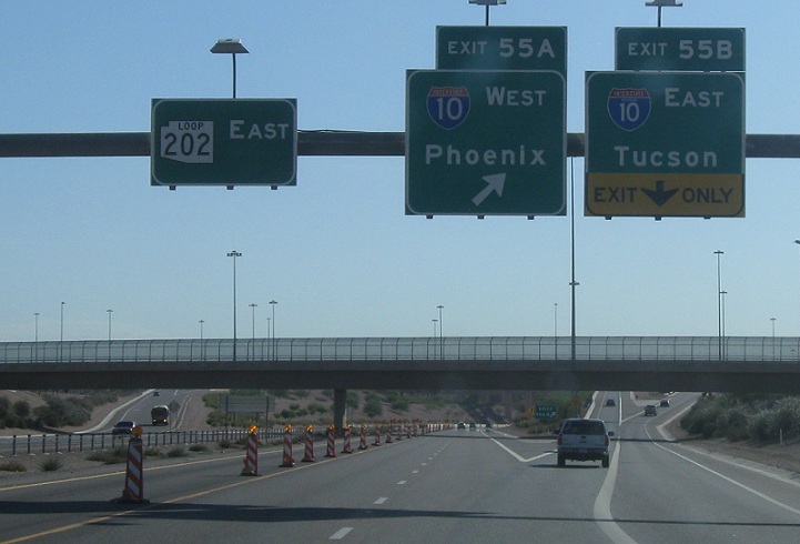Exit for I-10 east towards Tucson and I-10 west towards Phoenix. Stay straight for Loop 202 East and the Santan Freeway