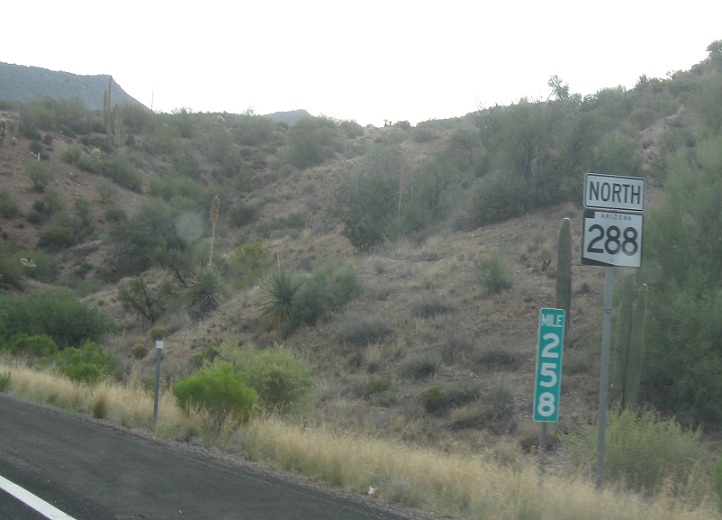 Reassurance shield at the beginning of SR 288. The road starts at milepost 258 and heads up to Young. The road alternates between paved and unpaved, but is mostly paved.