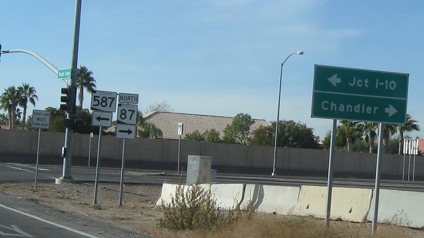 Just after we turn onto the Hunt Hwy, we’ll approach the 587 junction. Turn right for 87 North into Chandler and left for 587 South towards I-10