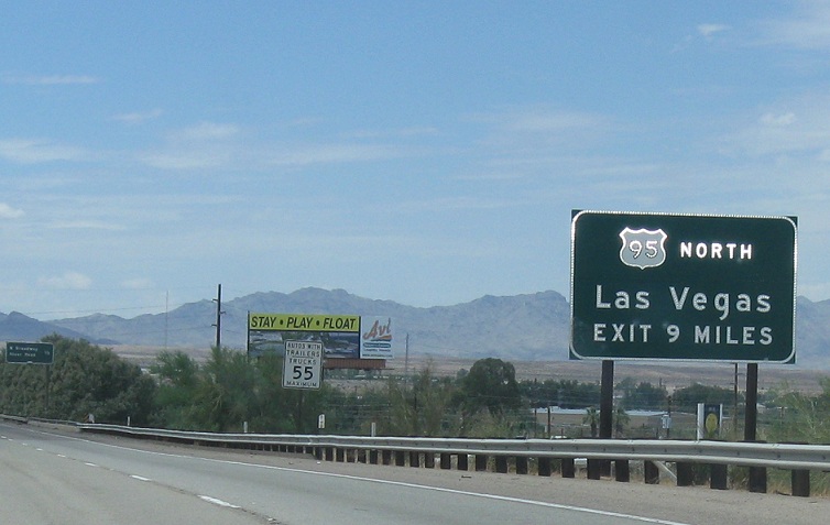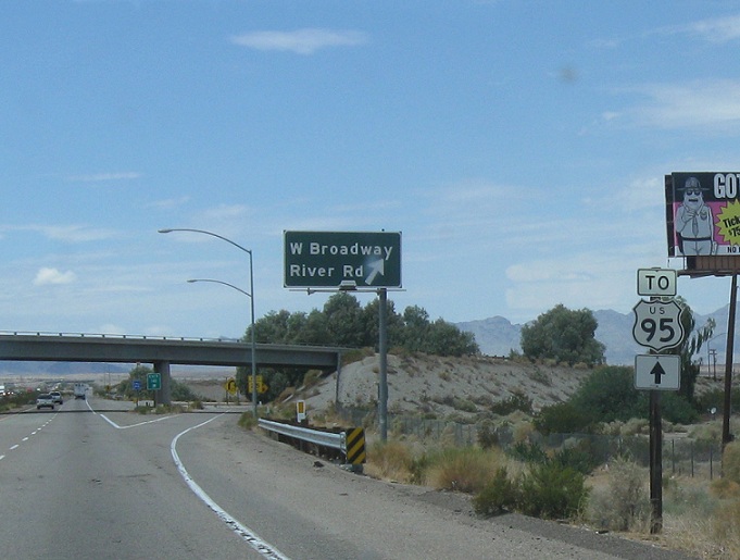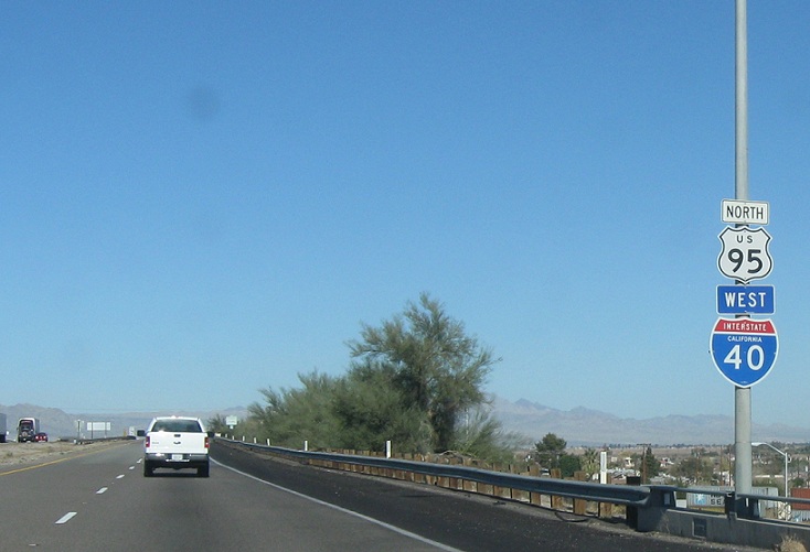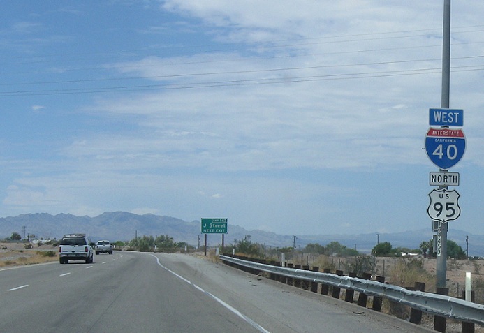 At J St, exit for Bullhead City, AZ. Exiting here connects to Arizona State Route 95, which is actually signed off the freeway. As a result, Caltrans is careful to sign US-95 through here.