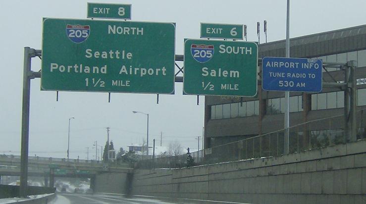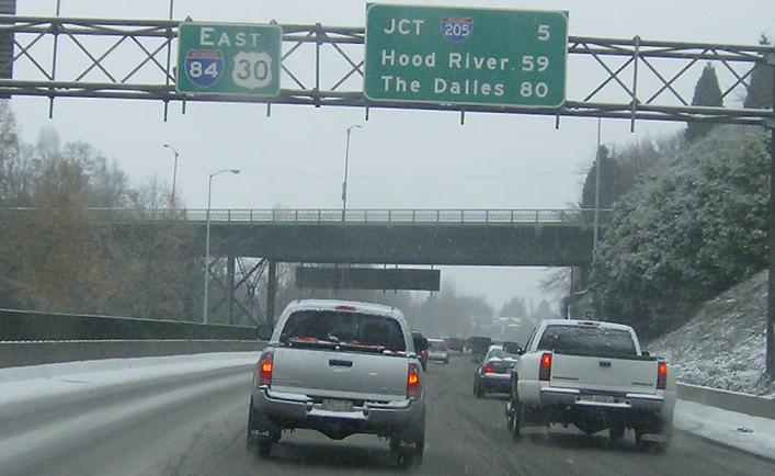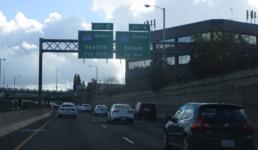 Junction I-205 coming up after the OR 213 interchange. I-205 will parallel I-84 for a mile, with southbound traffic exiting a mile before northbound traffic