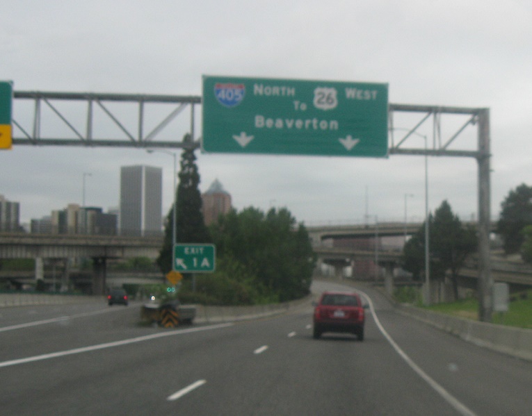 Immediately as I-405 begins, keep left to head up Harbor Drive into the city. Keep right for I-405 to US-26, with the “to” seemingly added as an afterthought.