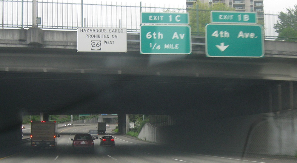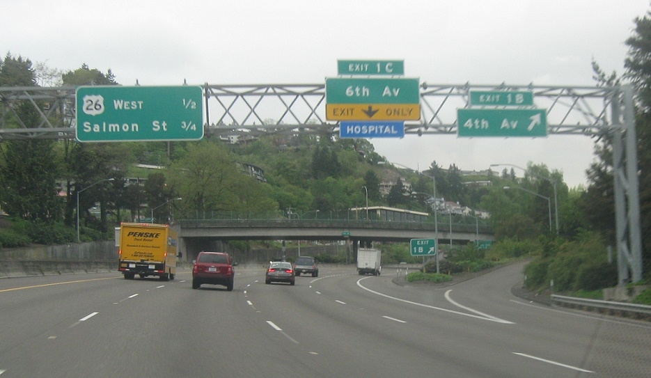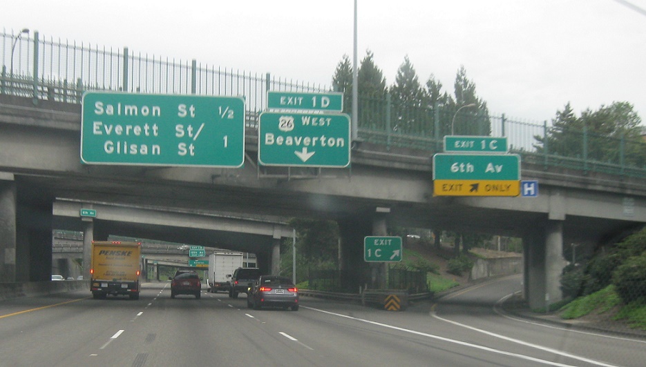 Exit here for 6th Avenue, which connects to US-26 east. There is no direct connection to 26 east from 405 north, but 26 west will join here for a couple hundred feet.