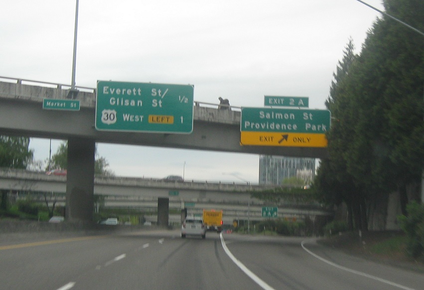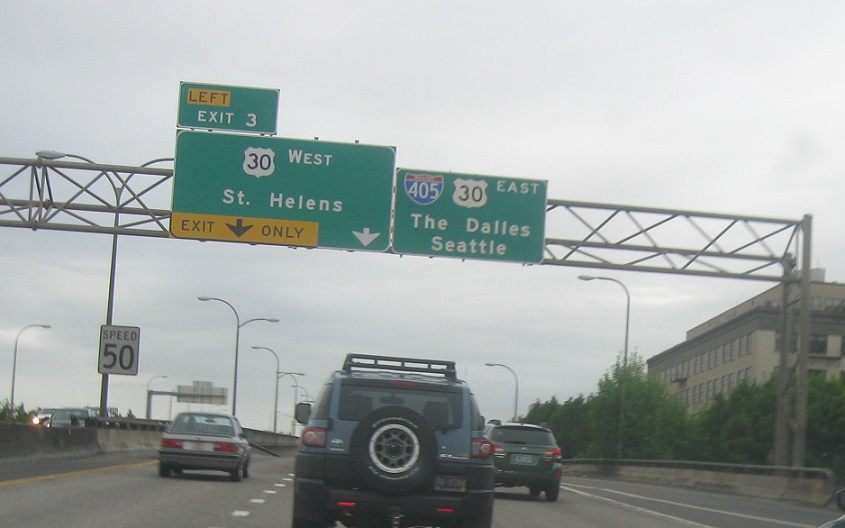 Exit left for US-30 west. 30 east will join I-405 to Interstate 5.