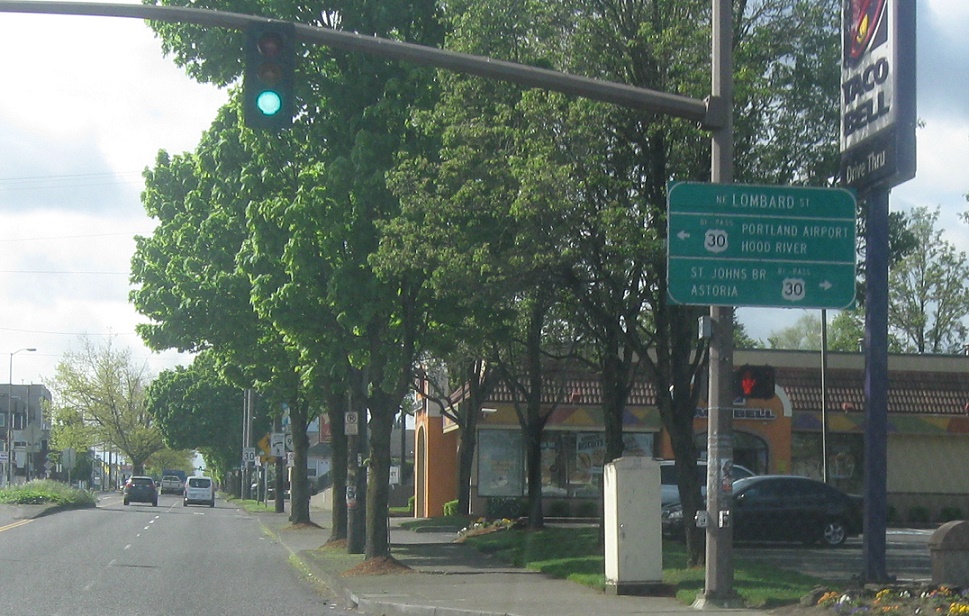 About a mile later, we’ll enter the Portland street grid and approach US-30 Bypass. Turn left to head towards the airport and right to head towards St. John’s Bridge.