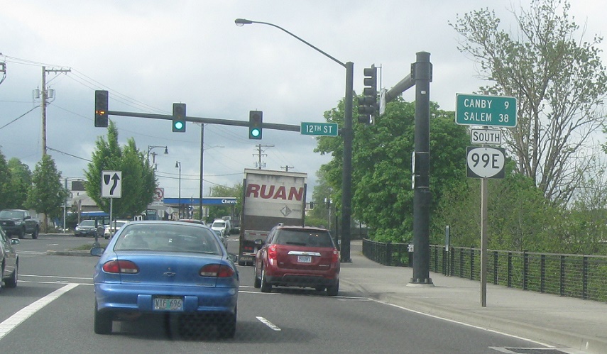 A couple blocks later, we’ll approach Main Street. Turn left here for here-unsigned Oregon 43, which terminates at this intersection. Stay straight to stay on 99E South.