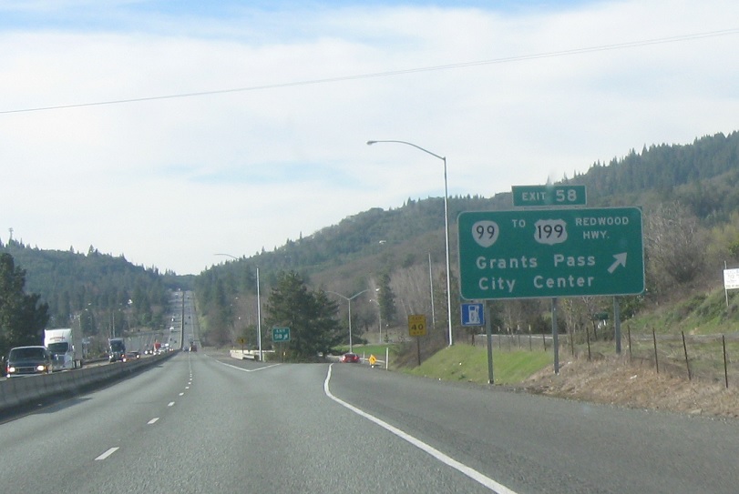 Exit for Oregon 99, which heads south to U.S. 199 and downtown Grants Pass. Oregon 99 north joins I-5 again.