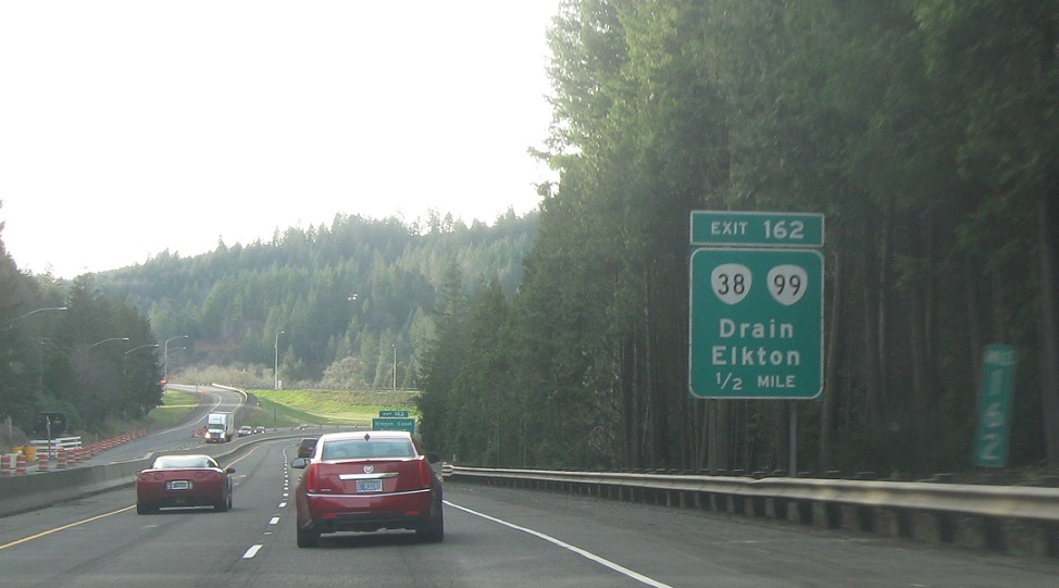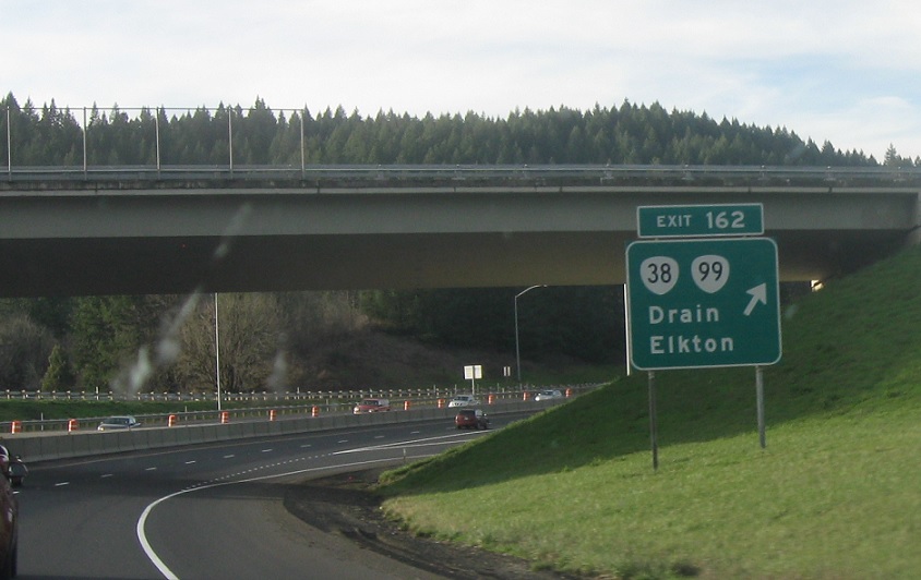 Exit for 38 west to Elkton. OR 99 joins again.
