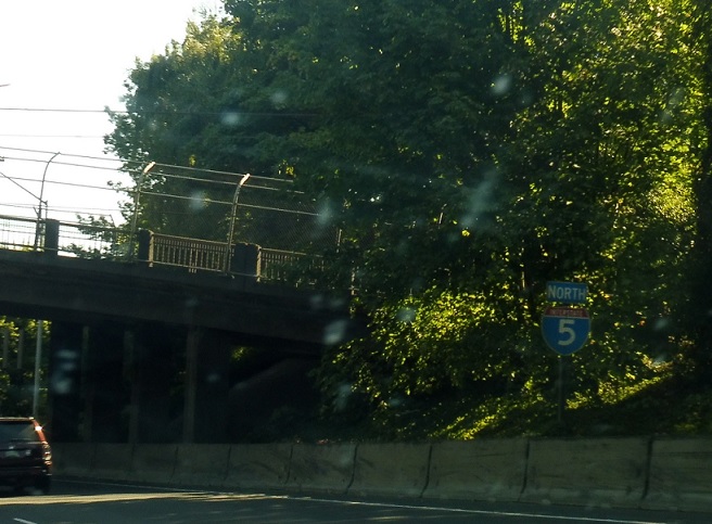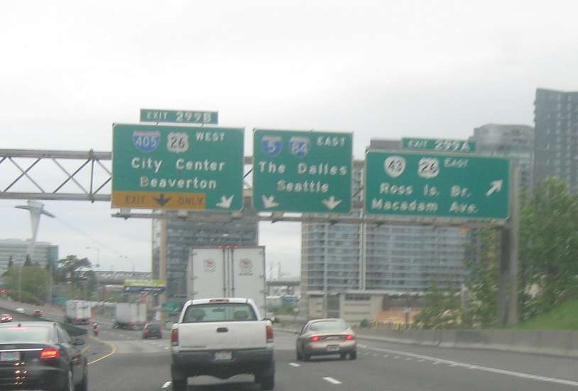 Reassurance shield after the Corbett Avenue interchange. We’re approaching the convoluted I-405/OR 43 junction, with connections to US-26 from I-5 north.