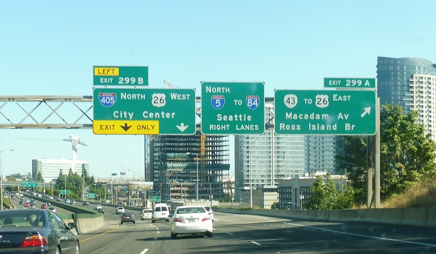 Exit for Oregon 43, which connects to US-26 and the Ross Island Bridge. Keep left for I-405 north, which connects to U.S. 26 west. Stay on I-5 to access I-84.