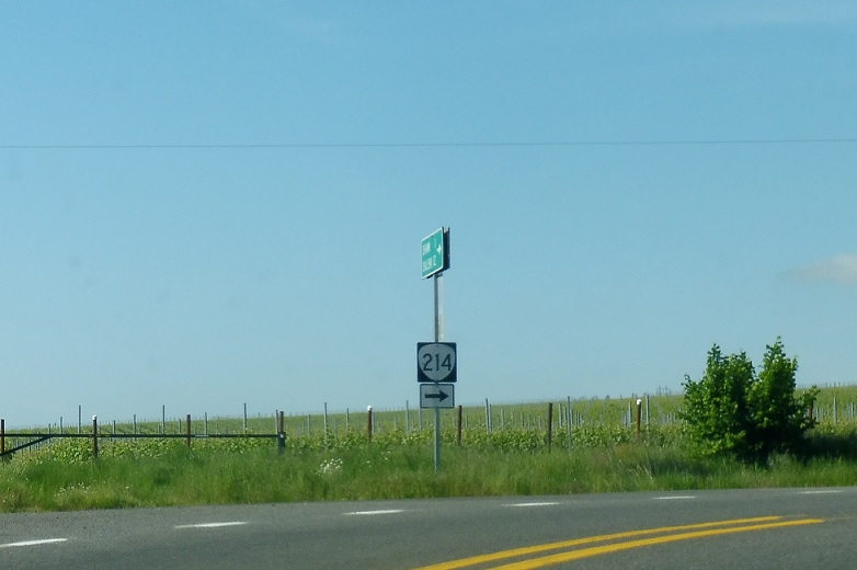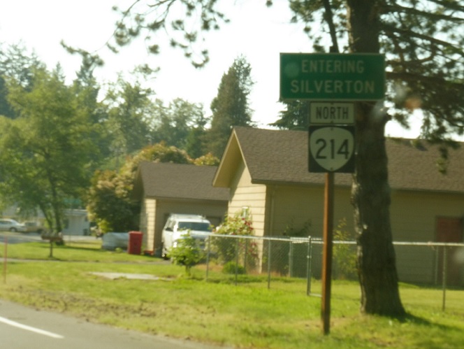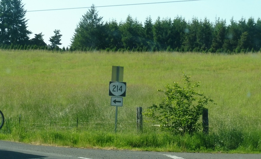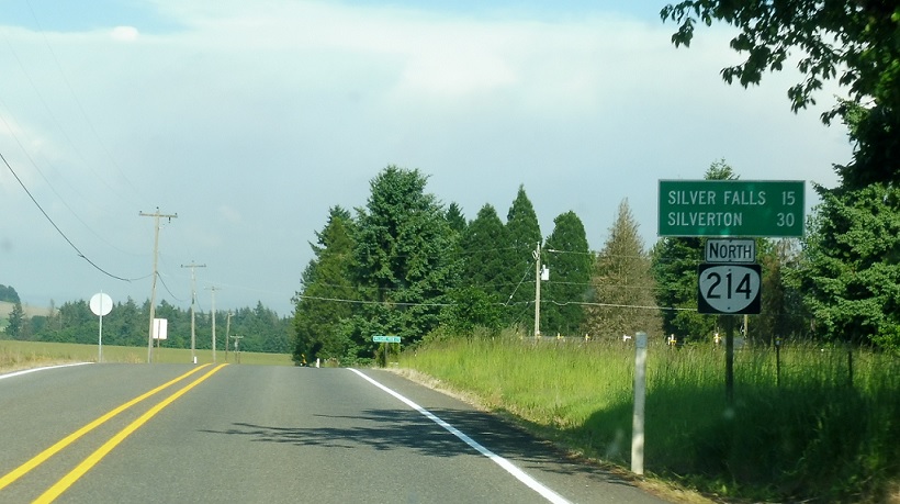 Reassurance shield as Oregon 214 begins. 214 follows a horseshoe shaped route, heading out to Silver Falls State Park and back.