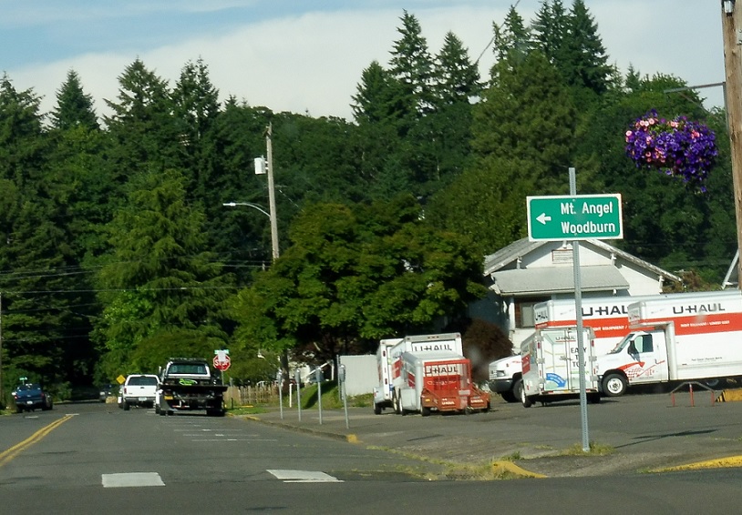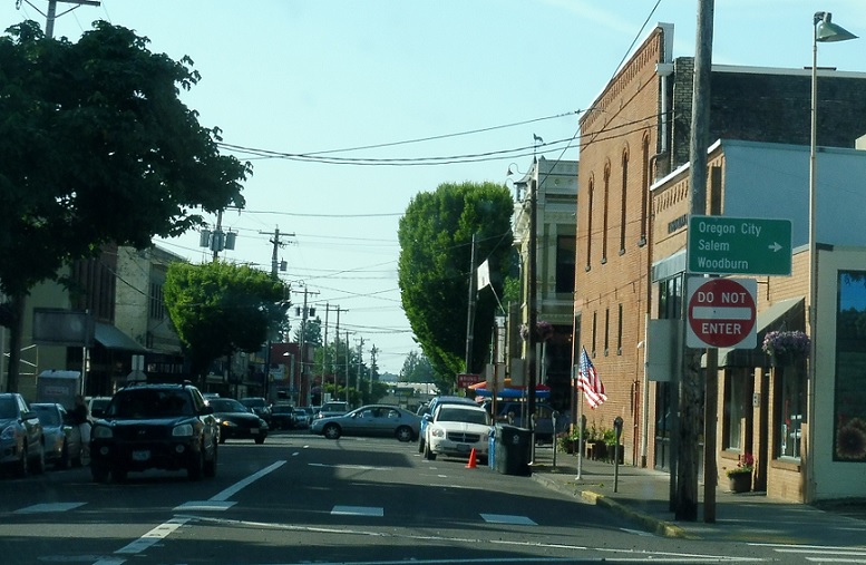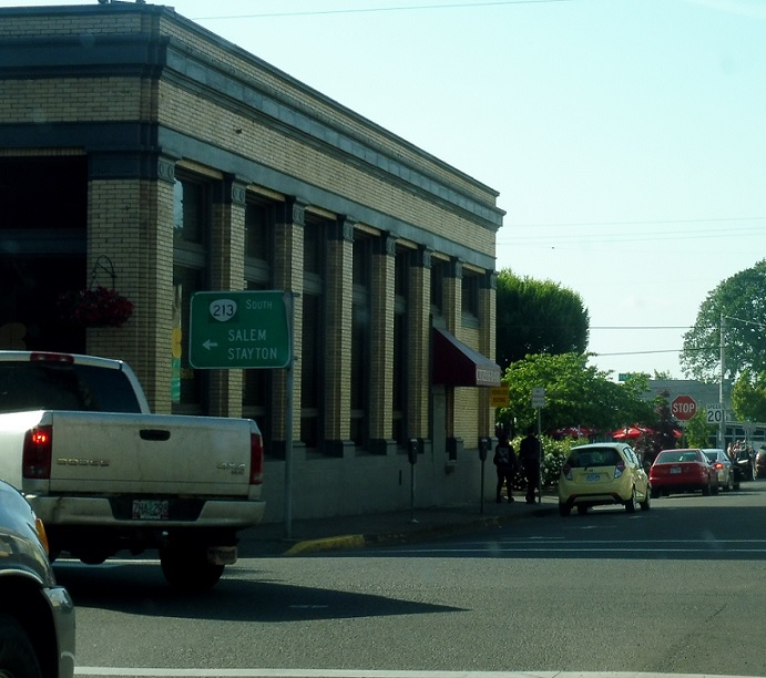 A few blocks later, turn right to stay on OR 214 as we enter downtown. We’ll also connect with OR 213 very shortly. This is the end of the Silver Creek Falls Hwy.