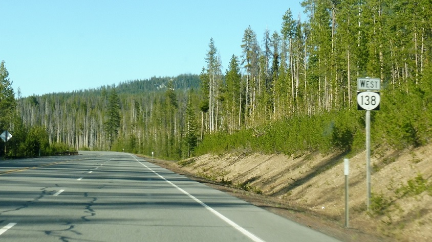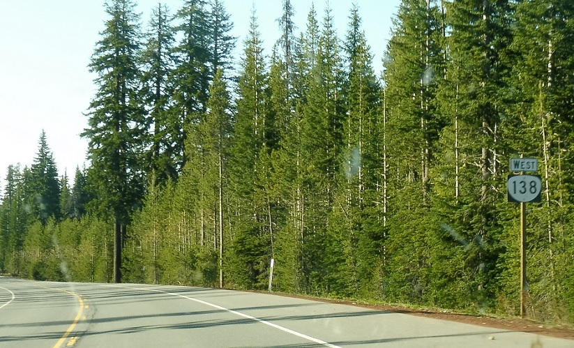 Erroneous US 138 shield several miles later. After Diamond Lake, OR 138 is a long, fairly boring descent through forest.