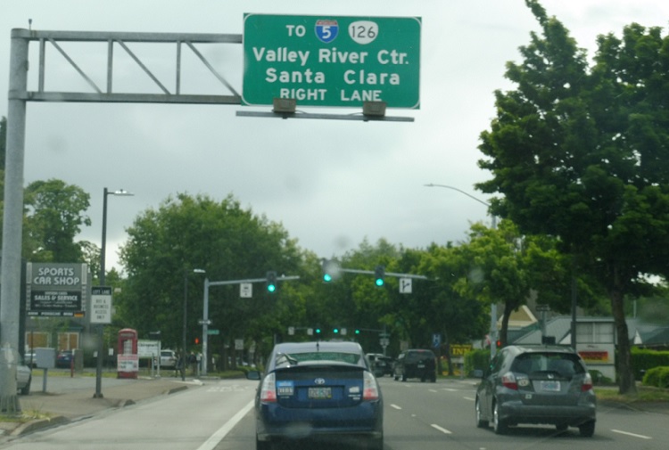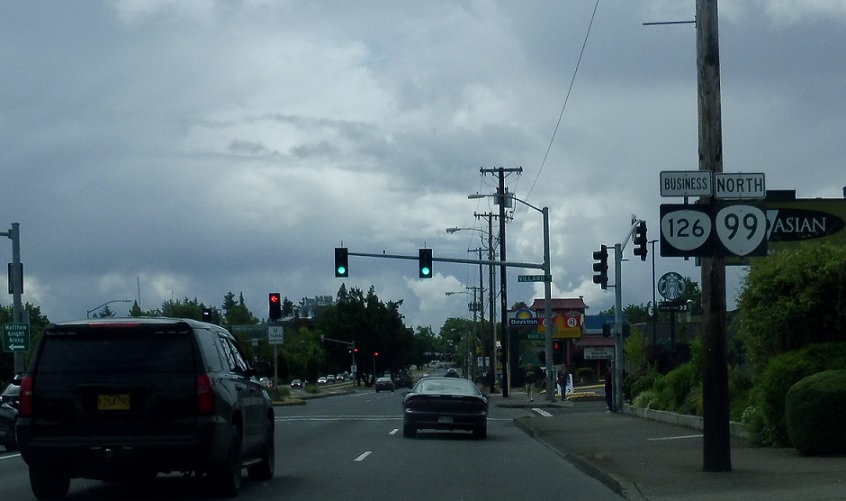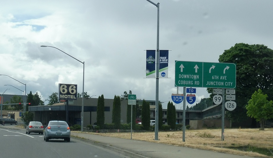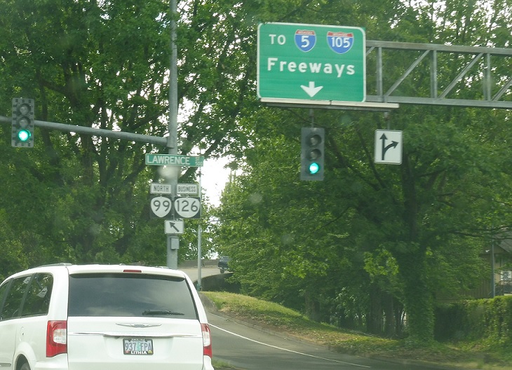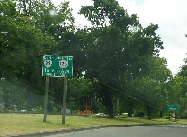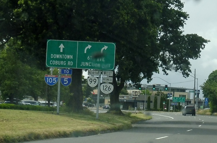 Keep right for I-105 and OR 126 east to I-5. Keep left for OR 99 north and OR 126 west, erroneously signed as OR 126 Business. OR 126 Business ends here.