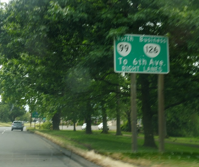 Keep right for 99 north/126 business west. Keep left for downtown and I-105 to I-5.