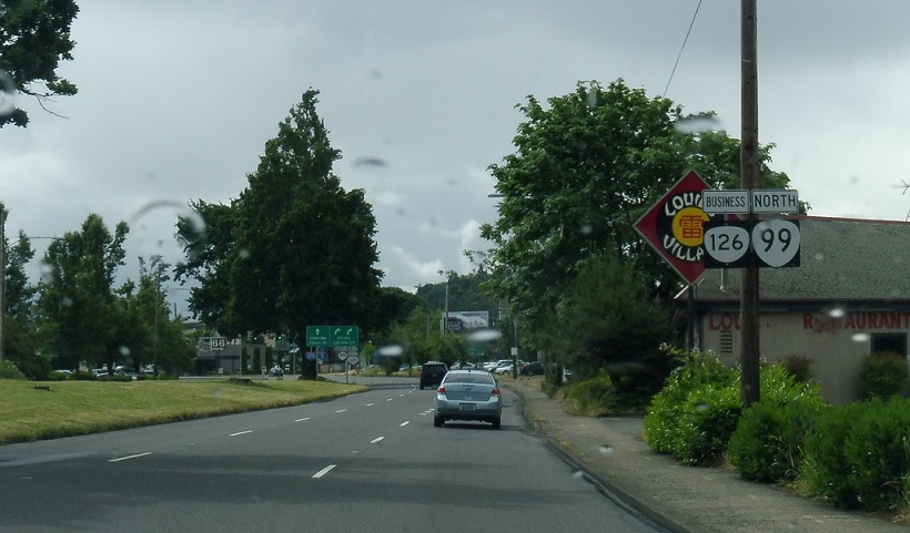 Reassurance shield as OR 99 joins 126 Business and local maintenance begins.