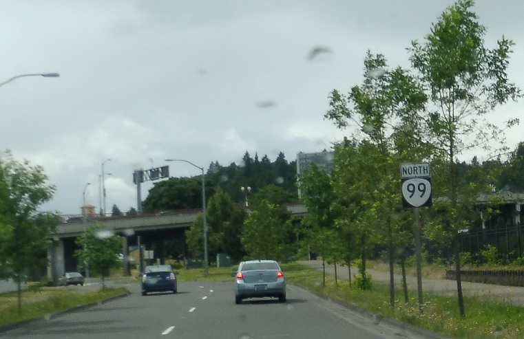As we approach downtown Eugene, keep right to stay on 99/126 Business. These two signs are in the same place on opposite sides of the street.