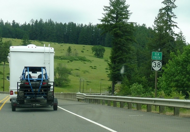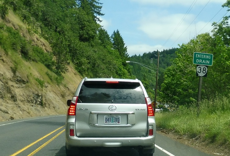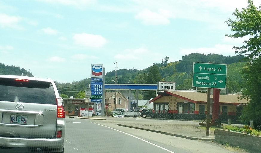 As we enter Drain, stay straight for OR 38 east/OR 99 north to Eugene. Turn right for locally-maintained 99 south to Yoncalla and Roseburg.