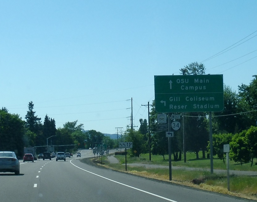 Turn left for OR 34 west. Navigational signage points to various Oregon State University destinations.