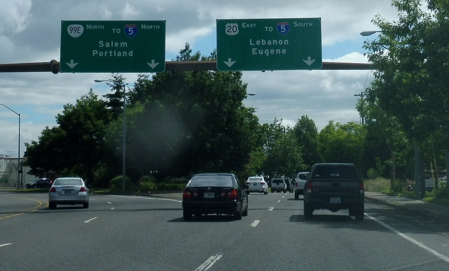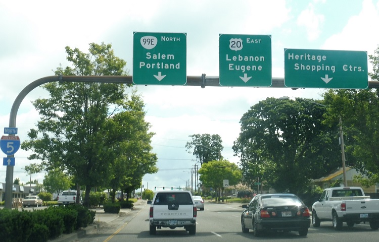 A few blocks after 99E joins 20, the two routes will prepare to split. Keep left for OR 99E to I-5 north and right for US-20 east.