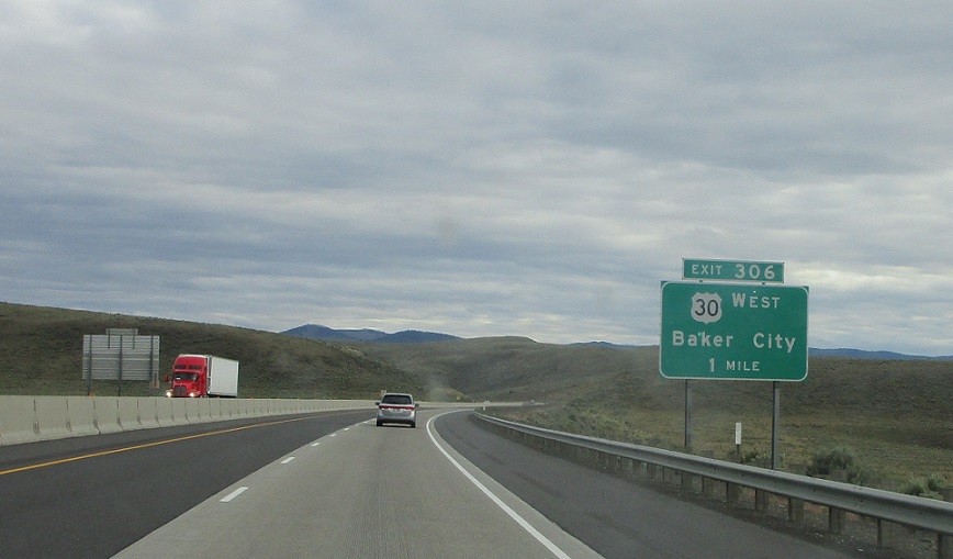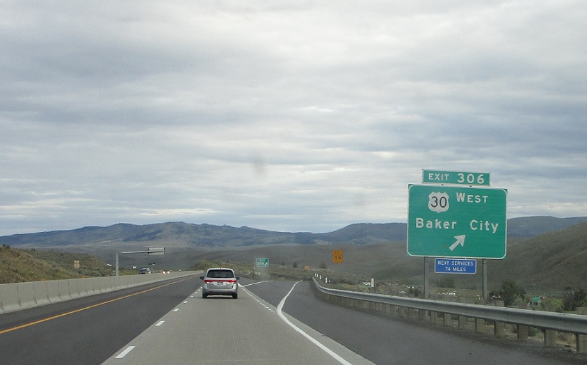 US-30 will rejoin the freeway here pretty soon, taking westbound 30 goes through downtown Baker City and up to Haines before rejoining I-84