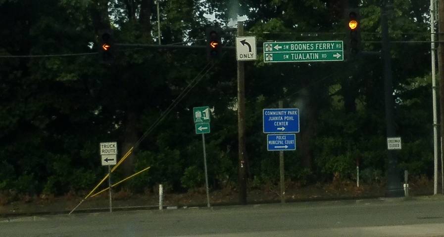 A few blocks later, we’ll approach Boones Ferry Rd. Turn left to follow Boones Ferry north to I-5. OR 141 south follows Boones Ferry Rd southbound.