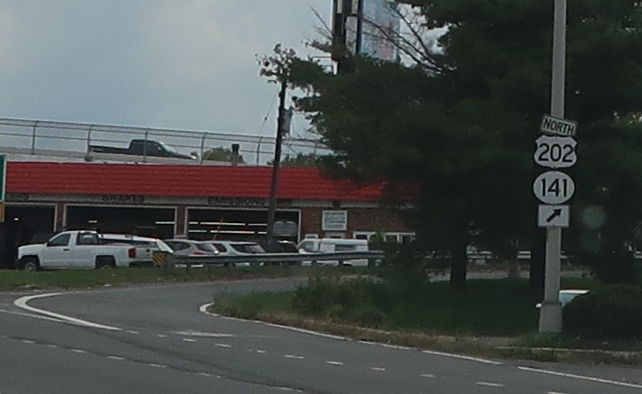 Exit for 202/141 north. Interesting that between 2015 and 2023 they appear to have added an arrow but not done anything to fix the crooked banner.