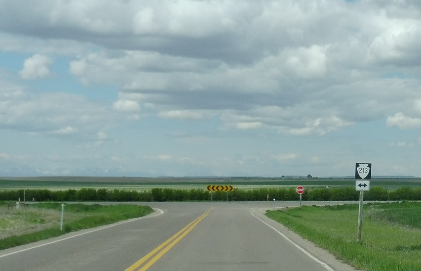 Several miles later, we’ll approach S-213. Turn right for 213 north towards Canada. Turn left for 213 south to Cut Bank.