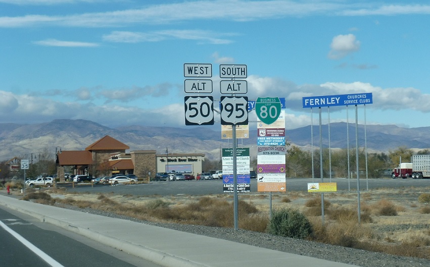 As we enter downtown Fernley, the U.S. routes will split south to head towards Yerington, Carson City, and Vegas. Stay on I-80 Business for Reno.
