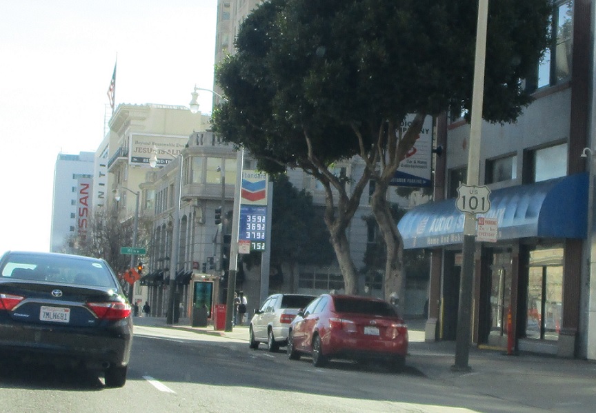 Reassurance shield a couple blocks later. Note the “Standard” station in the background – Chevron keeps one Standard station in each state where it own the right to the name “Standard,” and this is sort of the flagship station since Chevron was once known as Standard Oil of California.