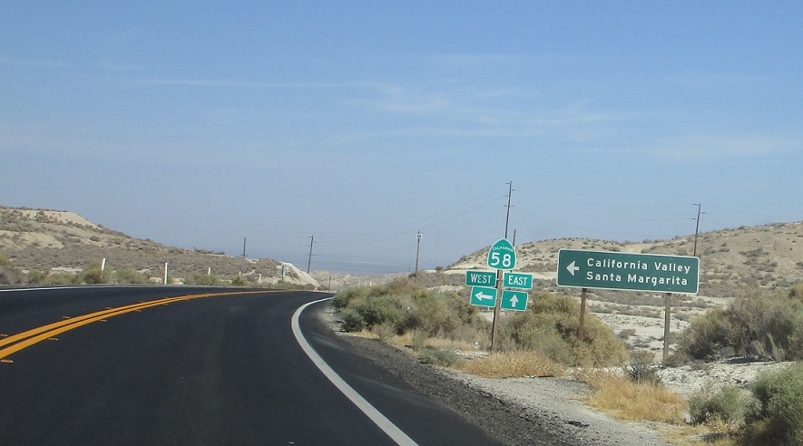 A few miles later, we’ll approach SR 58. Stay straight for 33 north/58 east. Turn left for 58 west towards Santa Margarita.