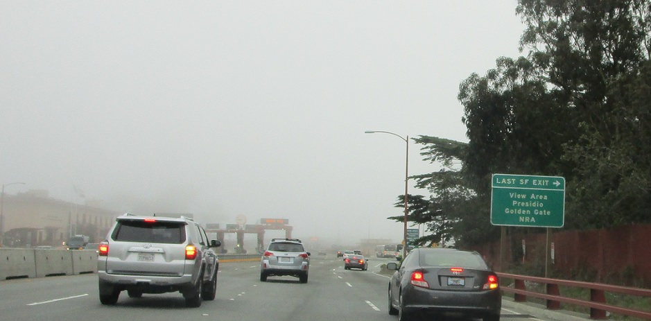 As 1 joins 101, we’ll quickly approach the Golden Gate Bridge. The toll plaza is visible on the left for southbound traffic.