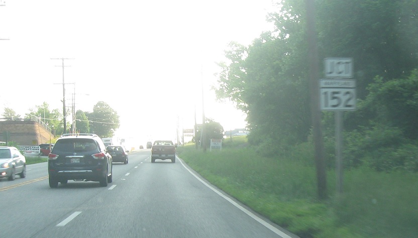 Just after that, we’ll leave Baltimore County and approach MD 152. Turn right for 152 east and left for 152 west.